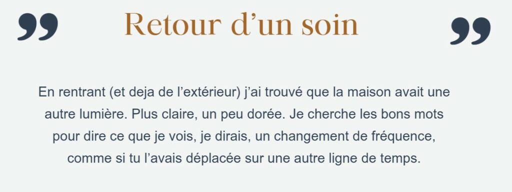 Vous devez pouvoir ressentir la différence quand le soin aura été effectué, c’est votre souveraineté. J’ai rencontré des personnes en consultation qui me disait qu’un énergéticien avait dégagé une entité et en fait, elle était toujours là. Je ne veux pas vous dire des choses pour installer des croyances en vous, tout mon travail vise à vous apprendre l’autonomie. Des personnes ne me réservent pas de soin à cause de cela mais tant pis, c’est inscrit dans mon ADN, les humains doivent redevenir leurs propres guides et ne dépendre d’aucune influence extérieure. Je m’inscris dans cette lignée, je ne peux pas faire autrement. Cela est exigeant mais c’est la voie de l’évolution.